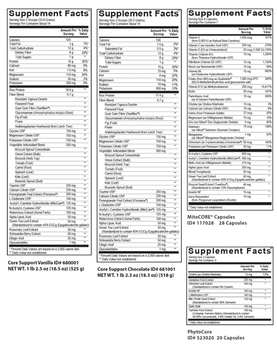 The Core Restore® program is a strategic system designed to safely enhance and promote all three pathways of active detoxification. The Core Restore® kit includes three active formulas—Core Support, MitoCORE®, and PhytoCore—which function synergistically to provide the energy and nutritional cofactors critical for active biotransformation. These formulas support both Phase I and Phase II pathways of liver biotransformation while promoting Phase III elimination pathways, aiding in the safe processing and removal of environmental pollutants, hormone disruptors, unhealthy estrogen metabolites, xenoestrogens (synthetic compounds that imitate estrogen) and other harmful toxins from the body. This powerful trio of specialized formulas provides essential micronutrients, phytonutrients and a source of easily digested, hypoallergenic protein that support the liver and fuel optimal biotransformation.