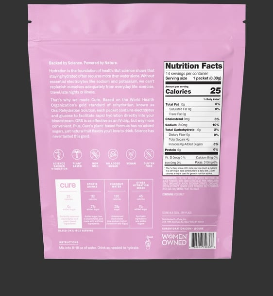 Named By Women’s Health as the Best Hydrating Drink Mix! Made with nature’s essential electrolytes from coconut water and pink Himalayan salt. Backed by Science. Powered by Nature. Hydration is the foundation of health. But science shows that staying hydrated often requires more than water alone. Without essential electrolytes like sodium and potassium, we can’t replenish ourselves adequately from everyday life: exercise, travel, late nights or illness. That’s why we made Cure.